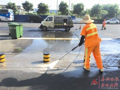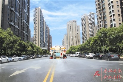 持续的高温,让路面变成了一个大蒸笼。望江西路作为高新区主干道,车流量大、通行人数多,是环卫保洁的重点路段。