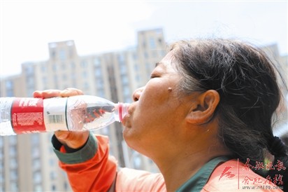 “现在气温太高了,每天能出好几斤汗,衣服湿得都能拧出水来!”黄宗英是蜀山区岳西路上的一名环卫工人,她拿出一条毛巾,一边擦脸一边说:“我每天上路都会带上一个大水壶,实在太累就找个阴凉的地方休息一下,多喝点水,体力一会就恢复了。”