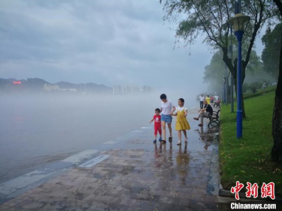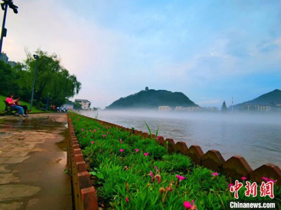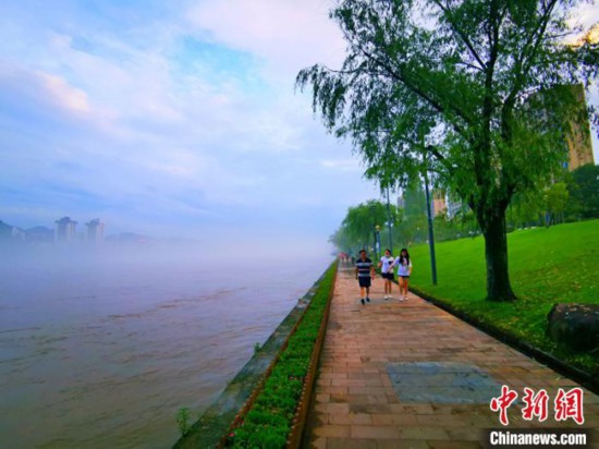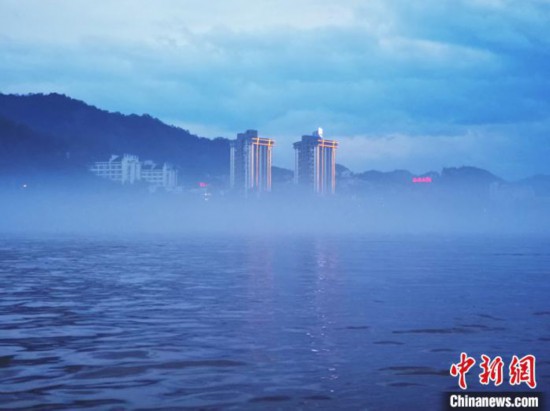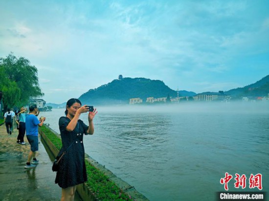 7月5日傍晚,安徽省黄山市新安江风景延伸带,雨后放晴,江面上出现一层似白纱一般的薄雾,江对面的楼阁山林等在薄雾之中,若隐若现,宛如天上仙境,吸引了许多市民拿着手机拍照。(刘浩\文 蔡季安\图)