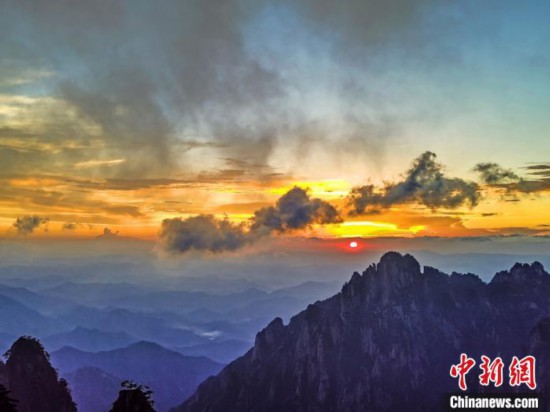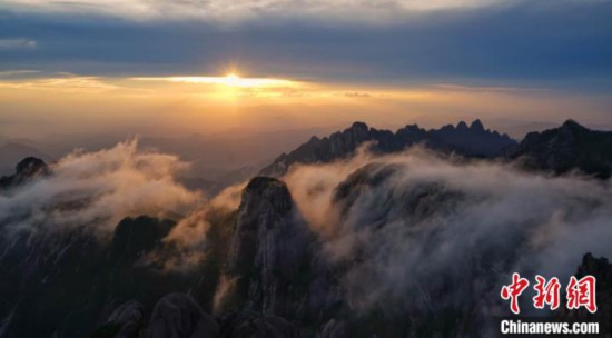 安徽黄山近日天气晴好,早晨5点半左右,旭日东升,霞光万丈铺洒在千峰之间。清晨的云雾在光照之下,熠熠生辉蔚为壮观。(刘浩 汪钰)