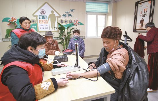 1月6日,在琅琊区西涧社区养老服务站,工作人员在为老人测量血压。建设完善12个街道养老服务中心、69个社区养老服务站是2020年我市十件为民办实事中的一项。目前,琅琊区已实现8个街道37个社区全覆盖,基本建成“居家社区机构相协调、医疗康养相结合”的养老服务体系,有效满足了老年人对美好生活的向往,提升了老年人的生活质量。进一步健全和完善了我市养老服务体系以及老年社会福利事业的发展。全媒体记者卢志永 特约摄影赵 辰摄