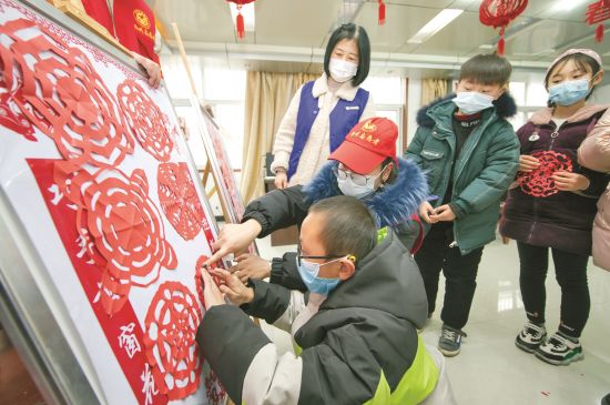 为加深辖区未成年人对中华传统节日的认知和感受,2月1日,同乐街道花园社区联合滁州供水“蓝背心”共同开展“巧手剪窗花,快乐迎新年”志愿服务活动。辖区小朋友在老师和社区大学生志愿者的指导下,通过学习传统民间剪窗花艺术,了解到春节的习俗,感受到浓浓的年味,体会到中华传统文化的魅力。图为小朋友们将剪好的窗花张贴在展示板上。