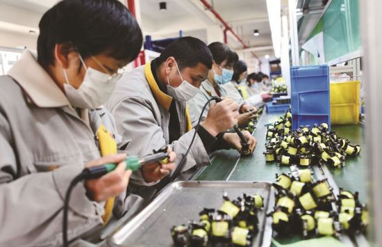 1月27日,位于天长市仁和集镇工业园区的富安电子有限公司车间内,“就地过年”的外地工人在加班加点生产出口韩国的变压器。春节临近,天长市城乡企业积极响应当地政府号召,采取提供食宿保障、错峰放假调休、增发节日工作津贴、留岗红包、过年礼包等措施,鼓励引导外地员工留在就业地安心过年。
