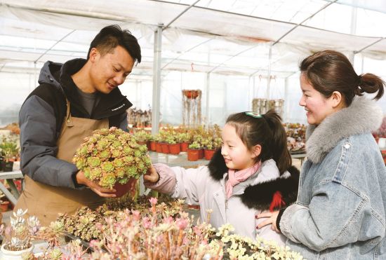 1月28日,全椒县石沛镇南塘花坊家庭农场,“90后”农场主齐勇在顾客介绍花卉植物。
