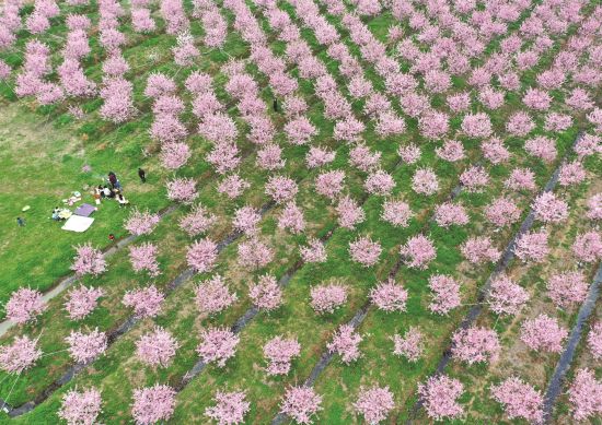 图为3月13日,游客在全椒县马厂镇龙山樱花园踏青游玩(无人机照片)。
