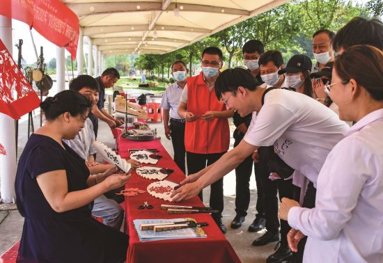 日前,明光市文旅局组织文化志愿者到八岭湖景区开展非遗进景区宣传展示活动,向景区游客介绍非遗保护的相关法律知识,带领游客深入认识和了解非遗保护传承的重要性。活动现场,还组织了滁州市级非遗项目“明光剪纸”“明光木杆秤”“清山艾条”进景区等宣传展示活动,受到广大群众的喜爱。 特约摄影王绪波 通讯员刘 捷摄