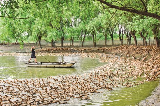 6月19日,在明光市七里湖蛋鸭养殖基地,明光市明光街道黄郢社区居民郁贤军在给鸭子喂食。