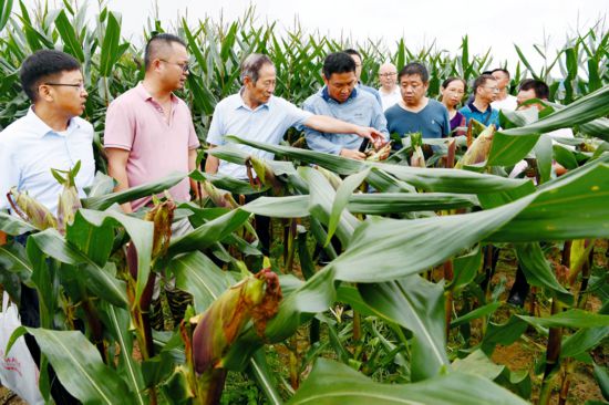 专家与种植大户查看黑糯玉米长势。